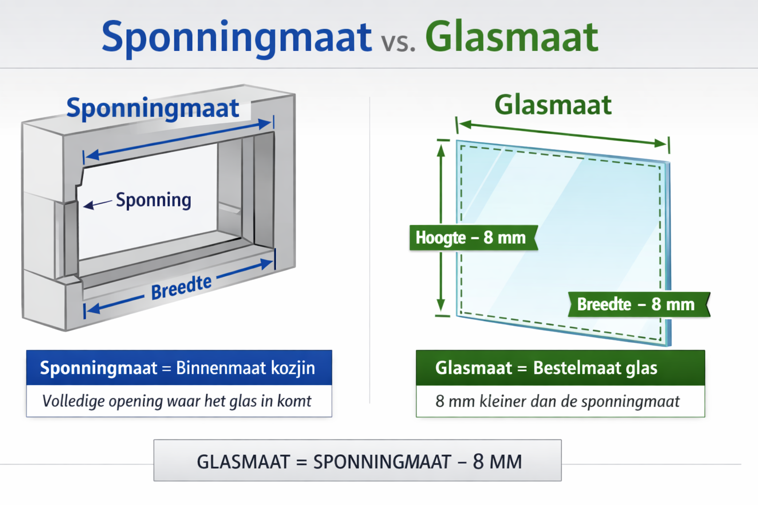 Neem steeds de kleinste gemeten maat als uitgangspunt en trek daar 8 mm speling van af. Deze speling is nodig zodat het glas kan werken bij temperatuurverschillen en om montageproblemen te voorkomen. Dit resulteert in de uiteindelijke glasmaat.